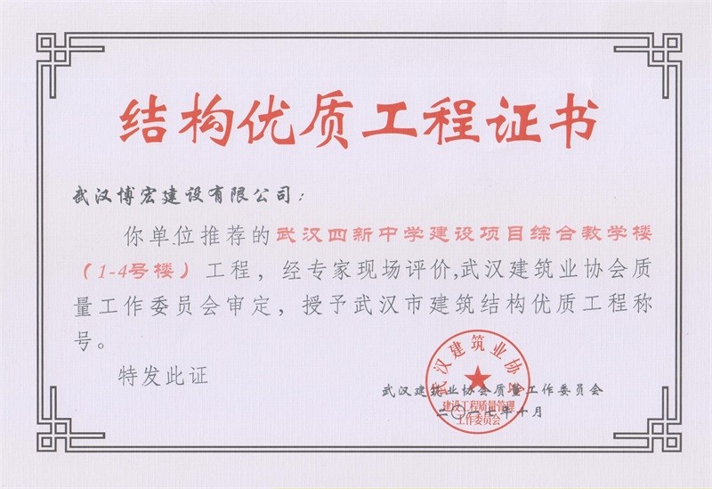 結(jié)構(gòu)優(yōu)質(zhì)工程證書(shū)(武漢四新中學(xué)綜合教學(xué)樓1-4號(hào)樓)