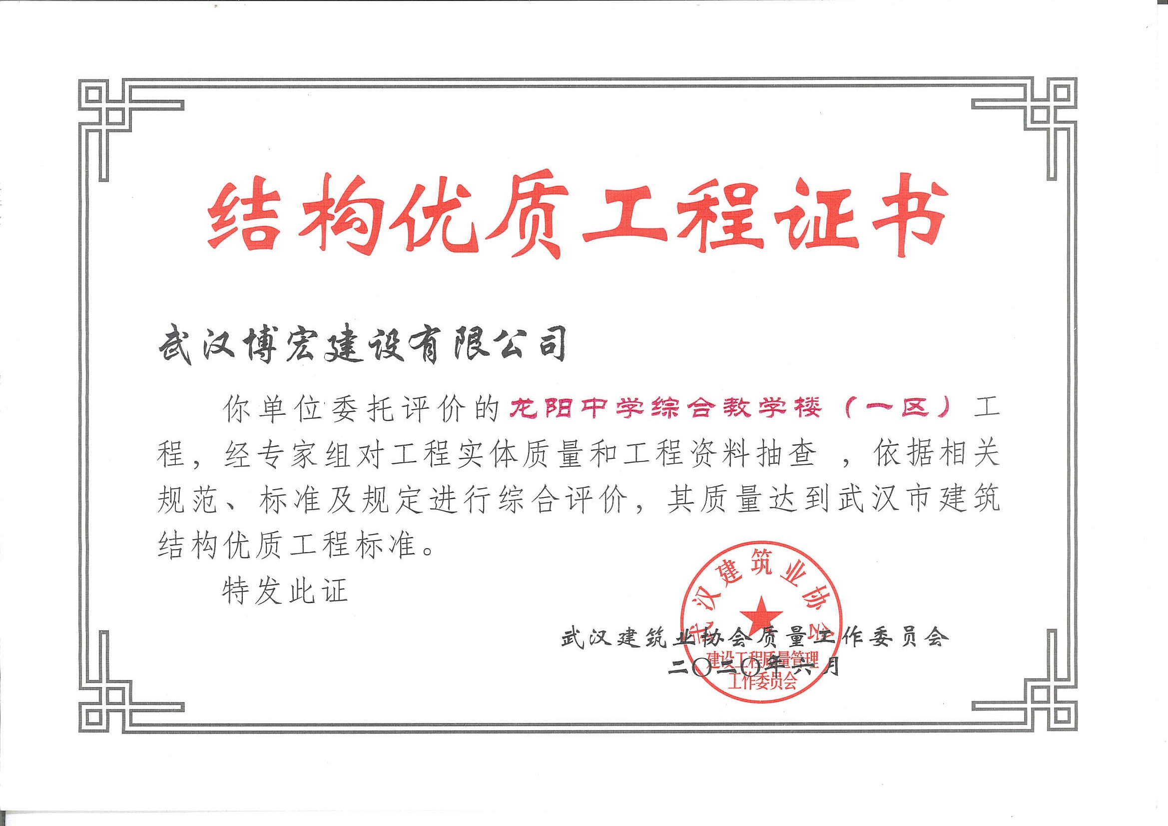 優(yōu)質(zhì)工程證書(武漢四新中學(xué)建設(shè)項目(教學(xué)樓)