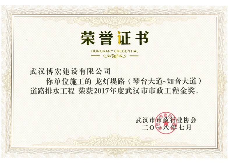 2017年度湖北省市政示范工程金獎(jiǎng)(墨水湖南路道排)