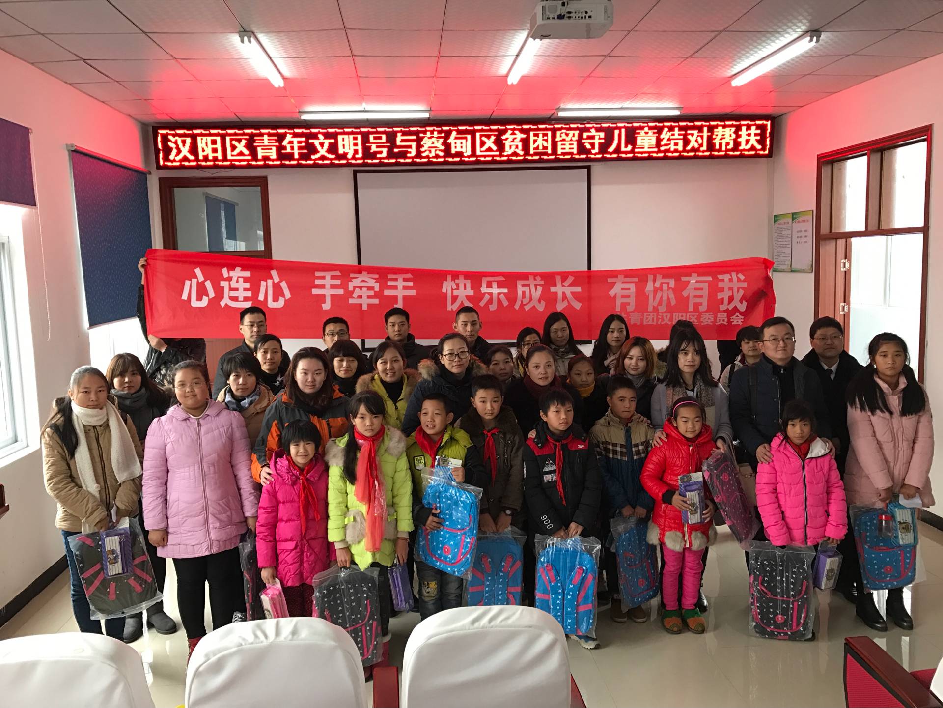 11月24日,為認(rèn)真落實(shí)共青團(tuán)助力脫貧攻堅(jiān)電視電話會(huì)議精神,根據(jù)“關(guān)愛留守兒童,助力精準(zhǔn)扶貧”行動(dòng)整體安排,漢陽團(tuán)區(qū)委組織全區(qū)20個(gè)市級(jí)以上青年文明號(hào)單位赴蔡甸區(qū)消泗鄉(xiāng),集中慰問幫扶貧困留守兒童,并進(jìn)行現(xiàn)場結(jié)對(duì),我公司參與了此次慰問幫扶活動(dòng)。
