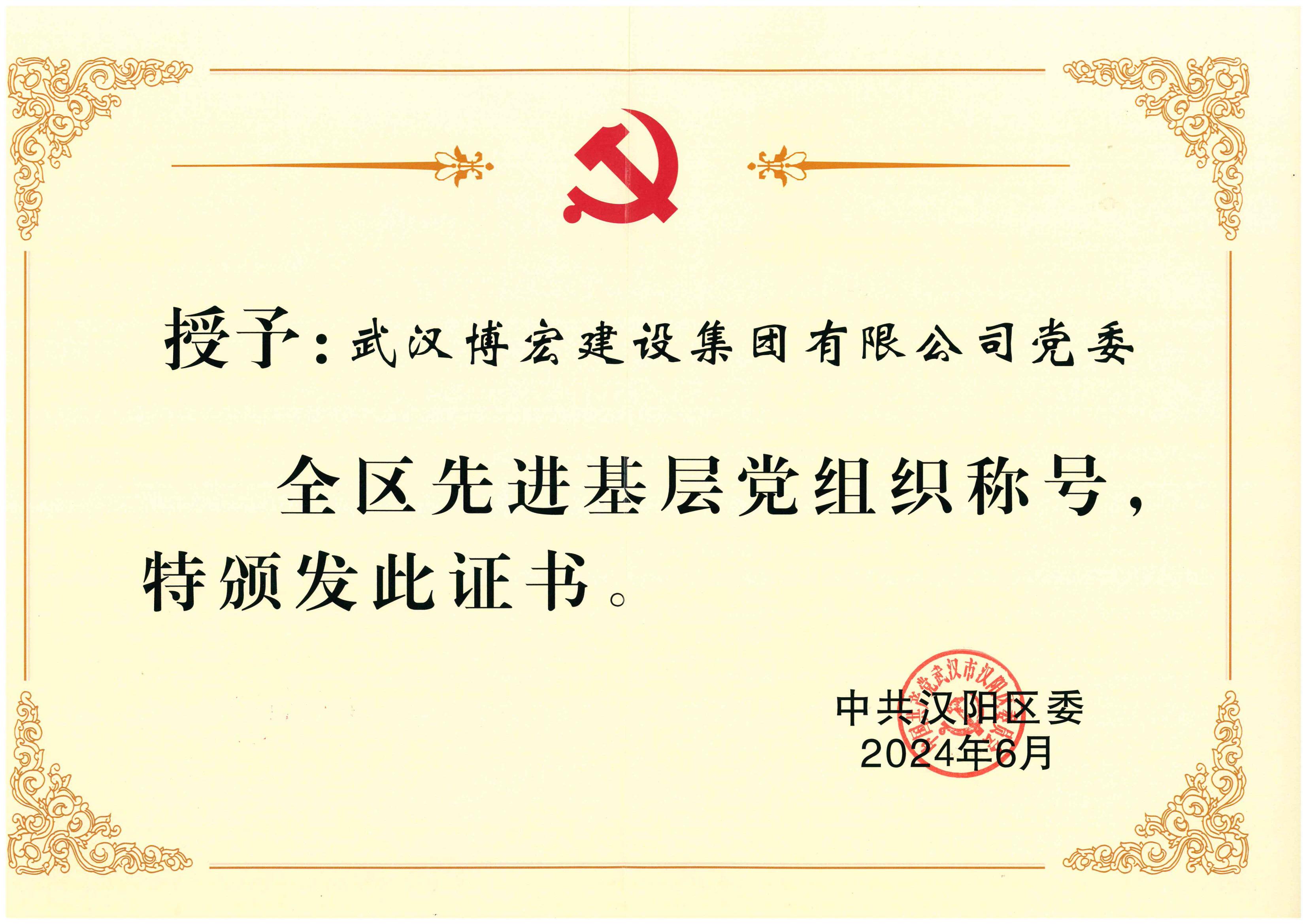 6月28日,漢陽(yáng)區(qū)慶祝中國(guó)共產(chǎn)黨成立103周年大會(huì)在區(qū)機(jī)關(guān)1號(hào)會(huì)議室隆重召開(kāi),大會(huì)對(duì)全區(qū)優(yōu)秀共產(chǎn)黨員、優(yōu)秀黨務(wù)工作者、先進(jìn)基層黨組織進(jìn)行了表彰,中共武漢博宏建設(shè)集團(tuán)有限公司委員會(huì)獲評(píng)漢陽(yáng)區(qū)“先進(jìn)基層黨組織”榮譽(yù)稱(chēng)號(hào)。